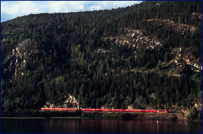 | Bild 27. Ustaoset, 13.07.2005: Westlich des Ortes führt die Bergenbahn auf einem Damm durch den Ustevatn. Von einer über den Damm erreichbaren Insel aus wurde Rt 61 auf seiner Fahrt nach Bergen beobachtet. ⇑ |