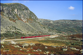 | Bild 34. Haugastøl - Tunga, 15.09.2009: Bm73 013 umfährt als Rt 62 den herbstlich gefärbten Talkessel zu Füßen des Gråskallen, der links im Bild erscheint. ⇑ |