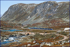 Sie steht ganz oben auf den Wunschlisten der Norwegentouristen: Die Bergenbahn. Keine andere norwegische Bahnstrecke führt so lange oberhalb der Baumgrenze durch Hochgebirgsflächen und -täler, die durch keine Straße erschlossen sind. Von Meereshöhe steigt die Bahnlinie auf 1237m Höhe (im Finsetunnel) an, um danach wieder auf Meereshöhe hinabzuführen. Auch Auf- und Abstieg der Bergenbahn durch wildromantische Täler sind landschaftlich faszinierend. Immer wieder sieht man Wasserfälle und Wildflüsse. Die in dieser Galerie betrachtete Strecke Oslo - Bergen soll wohl in der Variante über Drammen 526km lang sein, doch die Kilometrierung der Bergenbahn führt über Roa und bringt es dann auf 471km. Diese Längen sind mit Vorsicht zu genießen, da immer wieder einzelne Abschnitte begradigt wurden und werden.