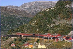 | Bild 72. Myrdal, 16.09.2006: Ein Seitental wird auf einem Damm gequert, dann verschwindet Lt 1836 im 5311m langen Gravehalsentunnel. Oberhalb dessen Portal hat man einen schönen Gesamtüberblick über die Siedlung Myrdal. Von den vier bunten Häuschen hinten auf halber Höhe war das orange für den Stationsvorsteher, das dunkelrote und das grüne für Bahnwärter und das gelbe für Bedienstete. Quelle "Banedata 2004" von Thor Bjerke und Finn Holum. ⇑ |