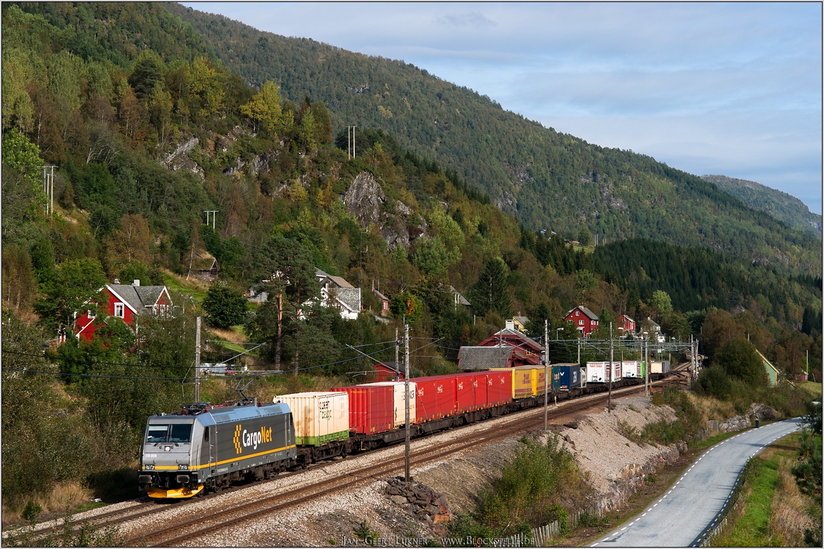 Urdland, 18.09.2009: 119 008 rollt mit ihrem Gt 5505 talabwärts Voss und Bergen entgegen.