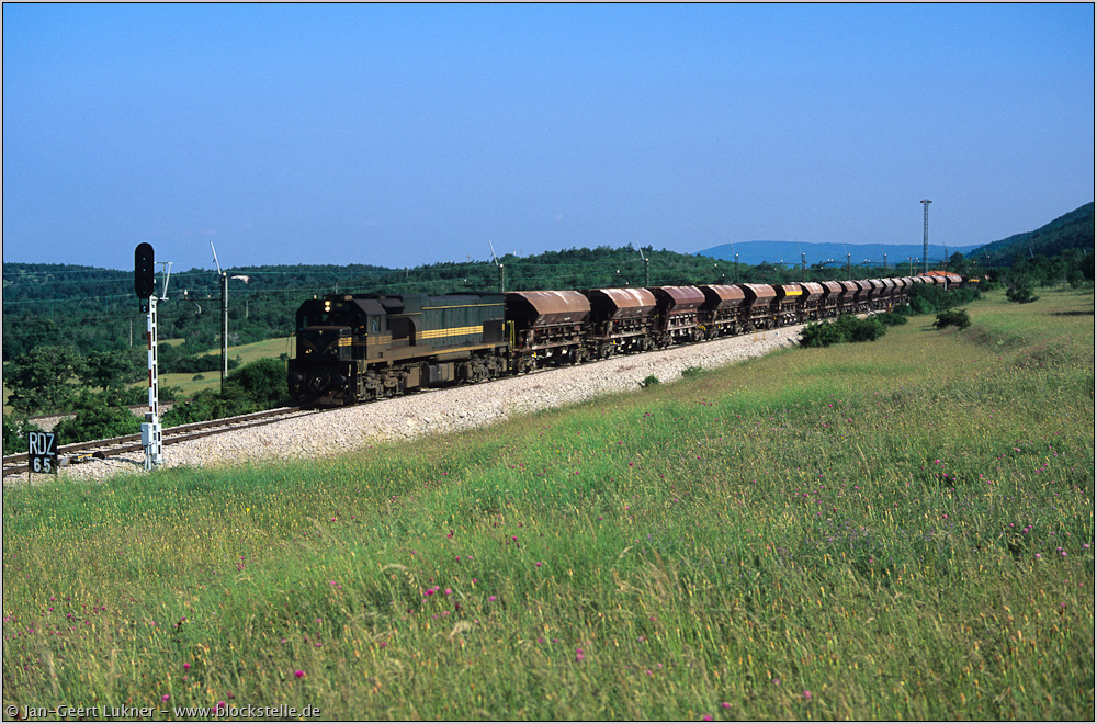 | Die Istrianerbahn beginnt ganz unspektakulär an einer einzelnen Weiche. Es handelt sich um die Abzweigstelle Prešnica, die noch ein gutes Stück südlich des gleichnamigen Haltepunktes liegt. Am 11.06.2008 hat der Schotterzug gerade die Koperbahn verlassen, die links im Bild steil in die Tiefe führt, während sich die Istrianerbahn noch ein Stück hoch oben durch die Felsen schlängeln wird. Der Güterzug fährt nur bis Podgorje, dem ersten Bahnhof hinterm Abzweig. | ||