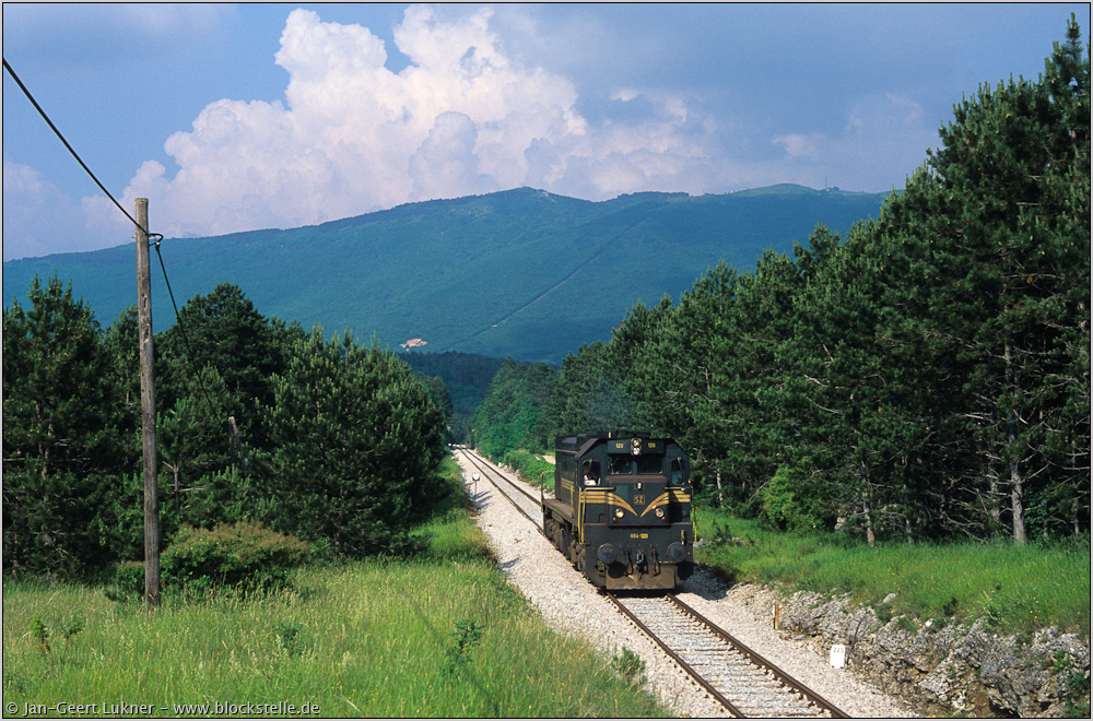 | Podgorje hinter sich gelassen hat am 11.06.2008 dieselbe Lok, die nachmittags den Istrien-Güterzug zu fahren hat. Leider gab es keine Wagen für Istrien, so dass die Lok nur Lz kam. Im Hintergrund erhebt sich der Slavnik bis zu 1028m über dem Meer. |