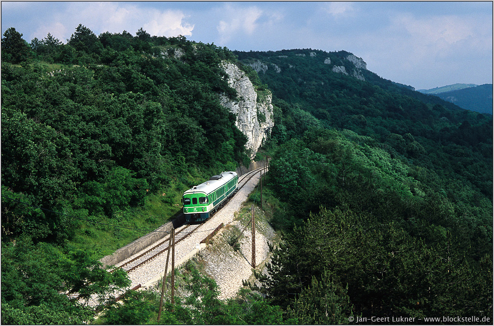 | Nur wenige hundert Meter weiter gelangt die Bahn durch einen Einschnitt an die Felskante hoch über den Ortschaften Podpeč und Zazid hinaus. Am 11.06.2011 gab es noch einen slowenischen Nahverkehrszug, der Mo-Fr bis ins kroatische Buzet hinüberfuhr. Der 711 kehrt hier bereits als LP 7704 aus Kroatien zurück. Heute gibt es diese Zugleistung auch noch - aber nur aus Rakitovec, der letzten Station vor der Grenze. | ||