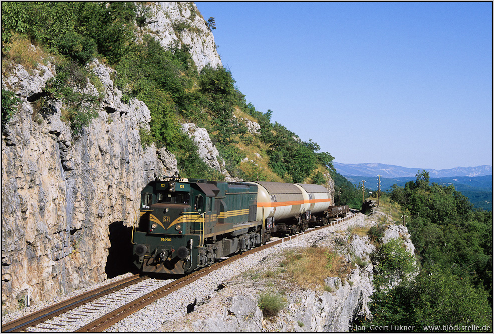 Und dann geht es so richtig an die Felswand ran. Nach Passieren der slowenisch-kroatischen Grenze befindet sich die Bahn wieder in der Felskrone hoch über einem Tal. Nach rechts geht es imposant in die Tiefe! Dort unten kommt auch die auf einem Hügel gelegene Altstadt von Buzet in Sicht. Die slowenische 664 hat am 17.07.2006 in Buzet den Gz 45548 übernommen und arbeitet sich entlang der Felsen in die Höhe.