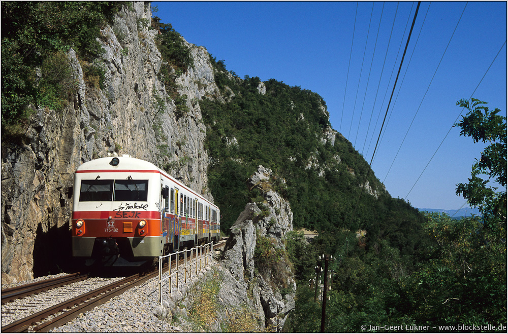 | Ein Stück weiter befindet sich der LP 7704 gerade im Übergang zwischen den waldigen Hängen und den Felskronen. Am 17.07.2006 verrichtete ein slowenischer 715 den Dienst als "kleiner Grenzverkehr". Die 715er waren leider damals schon ziemlich stark beschmiert. |