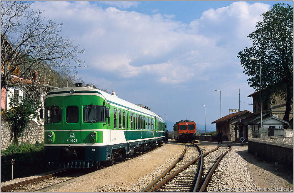 Der Bahnhof Buzet liegt rund 300m oberhalb der namensgebenden Kleinstadt in den Hängen, direkt unter den Felskronen. Seit der Grenzziehung ist dieser winzige Bahnhof nun zum "Zugbildungsbahnhof" geworden. Güter- und Schnellzug wechseln hier die Loks und bis 2010 konnte hier noch einmal am Tag vom slowenischen 711 in den kroatischen 7122 (ex schwed. Y1) umgestiegen werden. Diese allnachmittägliche Umsteigesituation konnte am 18.04.2003 im Bild festgehalten werden.