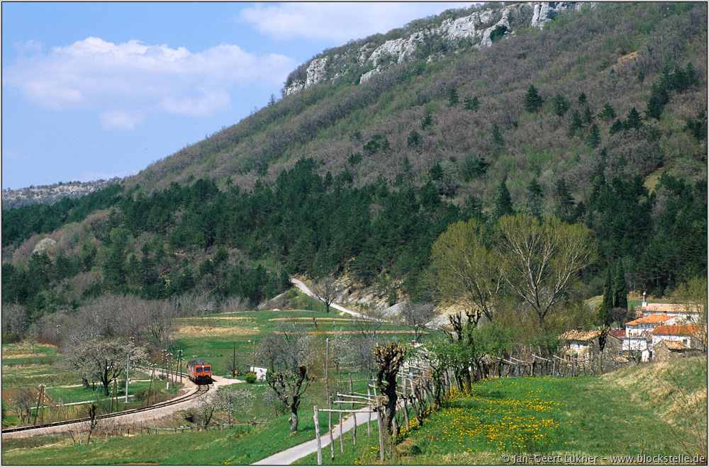 | Weit abseits der tief im Tal entlang führenden Hauptstraßen gelangt die Bahn an den Hängen der Ćićarija in den kleinen Talkessel von Nugla. Am 17.04.2003 war gerade der Löwenzahn erblüht, als Pu 4716 im Haltepunkt des Ortes hielt. |