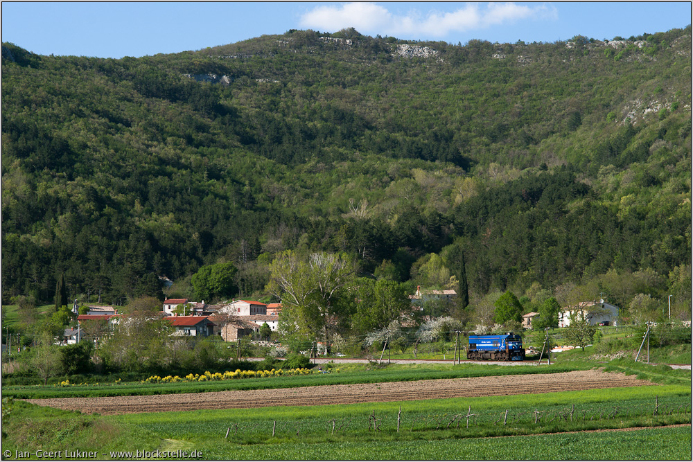 | Nugla zum Dritten: Am 28.04.2010 war das Grün an den Bäumen schon ein Stück weiter. Leider gab es auch an diesem Abend keine Fracht für den Gz 45549 in Richtung Istrien, so dass die Lok solo vor der Ortskulisse Nugla fotografiert werden musste. |