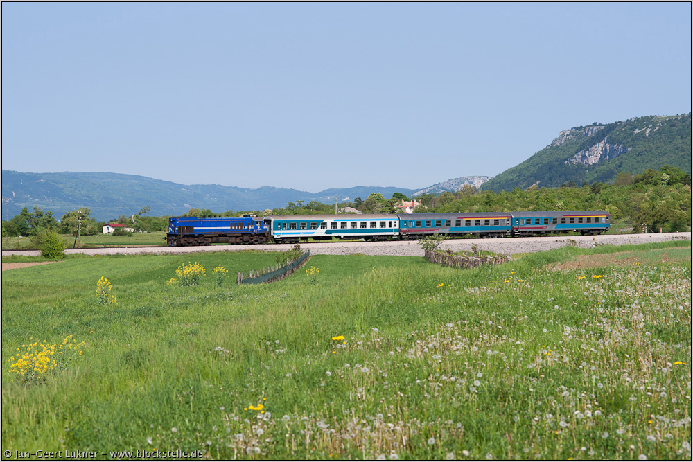 | In den Folgejahren setzte man beim "Istra" aber wieder auf lokbespannte Züge. Die kroatische 2062 hatte den aus slowenischen Wagen bestehenden B 1472 in Buzet von ihrer slowenischen Schwestermaschine übernommen und rollt am 30.04.2010 zwischen Nugla und Roč ihrer Wege. |