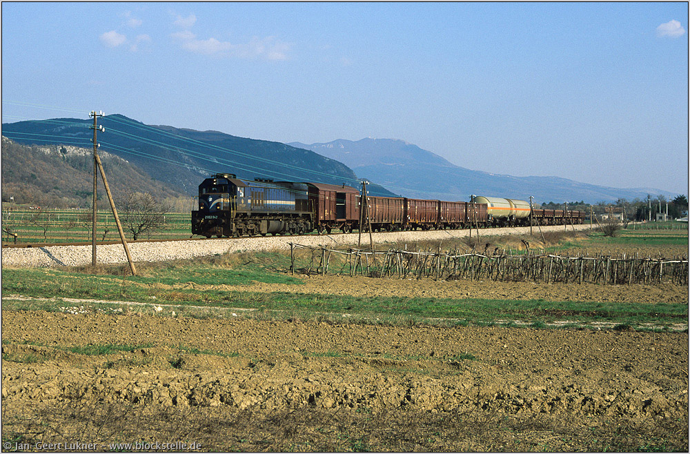 | Die Bahn klettert an den Hängen kontinuierlich in die Tiefe. Bei Ročko Polje ist das Höhenniveau der Hauptstraße erreicht. Am 01.04.2005 hatte der Istriengüterzug 45548 eine sehr "klassisch" aussehende Wagenzusammenstellung am Haken. |
