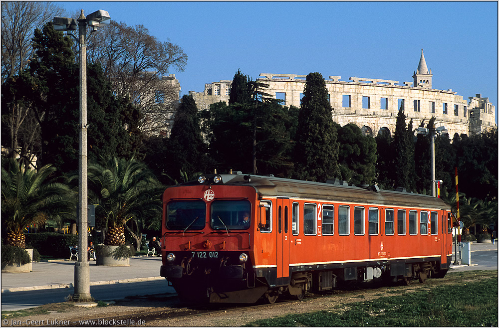 | Und dann ist auch schon Pula erreicht. Bis vor einigen Jahren konnte man sogar ein Stück südlich des Bahnhofs von Pula aussteigen - am inoffiziellen Haltepunkt Pula Obala (=Küste). Am 16.04.2003 war Pu 4713 hier gerade angekommen und wird in Kürze ins Bw zurücksetzen. Das Kolosseum ist eines der besterhaltensten Bauten dieser Größe aus der Römerzeit. |