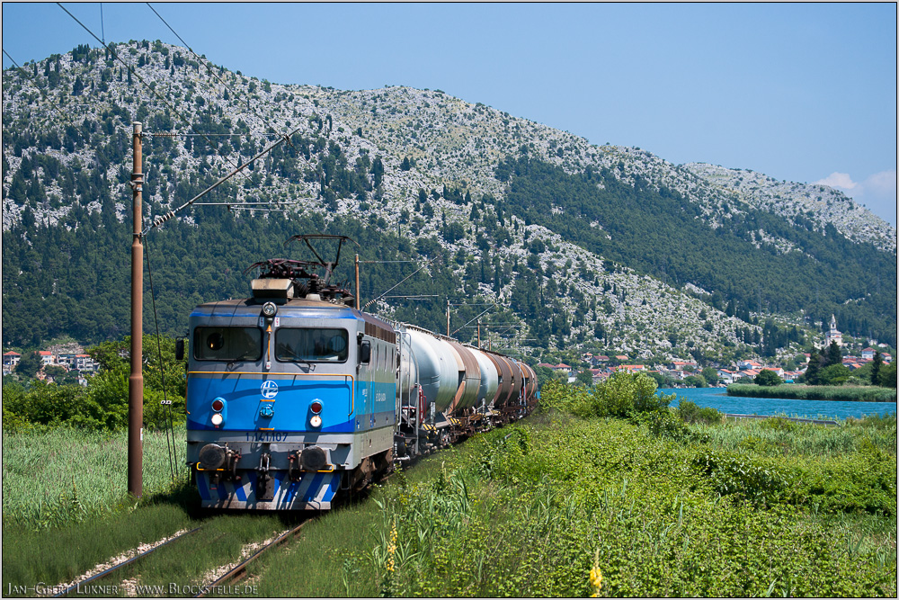 | Mitten in den Neretvasümpfen liegt der kleine Haltepunkt Banja, dem sich am 06.06.2010 ein Güterzug nähert. Im Hintergrund ist der Ort Komin zu sehen. |