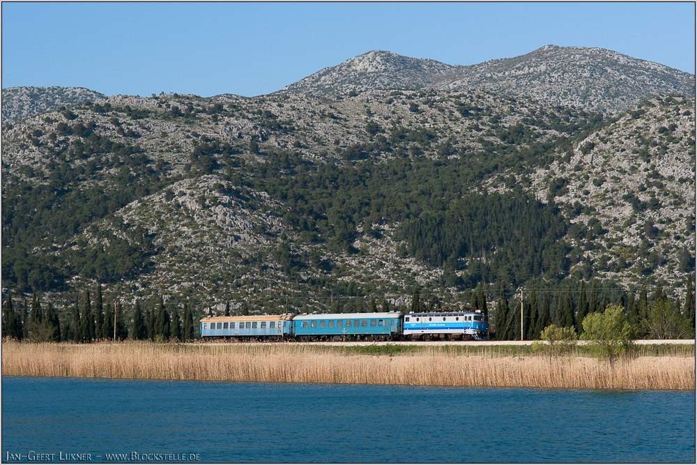 | Mittlerweile einziger verbliebener grenzüberschreitender Zug auf dieser Route ist der B 390 Ploče - Sarajevo mit seinem Gegenzug. Am 09.04.2011 bestand er aus zwei alten schwedischen Wagen, die nach dem Krieg als Fahrzeugspende nach Bosnien gegangen waren. Bei Opuzen führt die Strecke direkt am Fluss entlang. |
