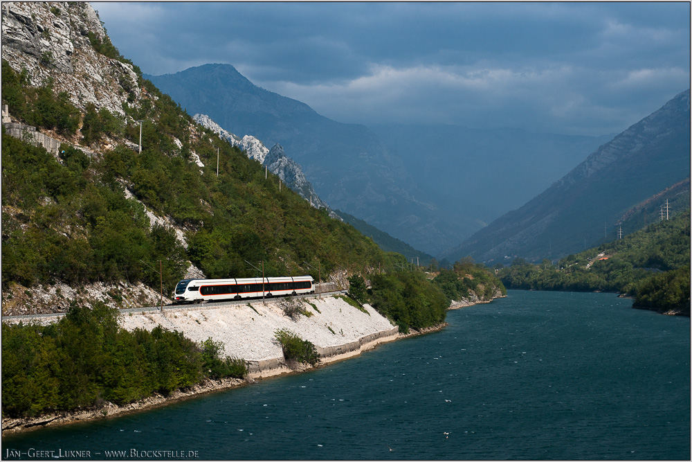 Noch eindrucksvoller zeigen sich am 27.08.2012 die Wolken beim Blick von der Straßenbrücke über die Neretva. Als neuen Paradezug setzte die ŽFBH einen Vorführtriebzug des kroatischen Herstellers Končar zwischen Sarajevo und Mostar als IC 543 ein. Leider hat sich dieses Zugpaar kein halbes Jahr gehalten, obwohl dem Verkehr zwischen den beiden Orten touristisch immer mehr Bedeutung zukommt.