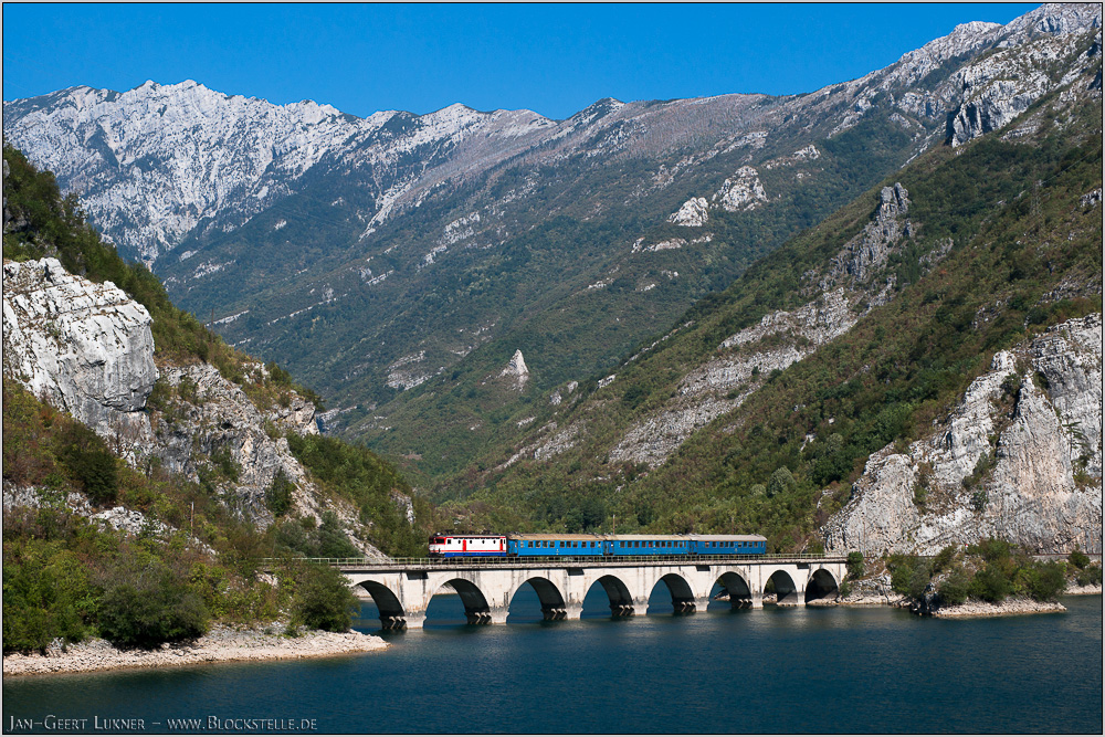 | Der nächste Nebenfluss mündet in Grabovica in die Neretva. Es handelt sich um die Diva Grabovica, die von der Bahn über eine hübsche Betonbogenbrücke gequert wird. Am 28.08.2012 rollt der stark verspätete B 391 über die Brücke vor eindrucksvoller Felsenkulisse. |