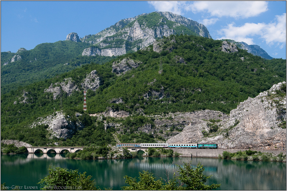 | Für Nordfahrer lässt sich die Brücke so aufnehmen. Am 07.06.2010 rollt B 396 bei Grabovica durch die Neretvaschlucht. Er hatte an diesem Tag sogar eine Lok in der ungewöhnlichen grünen Lackierungsvariante vor. Graffiti auf dem ersten Wagen wurden nachträglich elektronisch beseitigt. |