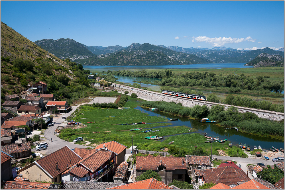 Nun stand das nächste 'Must Have' auf dem Zettel: Vranjina. Zur selben Zeit wie gestern war heute Morgen ein Autologistikzug voller Fiats aus Kragujevac südwärts gefahren. Den leeren Gegenzug hatten wir gestern nach 11 im Gebirge gesehen. Wir hofften, den am bekannten Ortsblick Vranjina nehmen zu können. Als wir dort aus dem Auto stiegen, wurden wir gleich auf englisch angesprochen, ob wir ne Bootstour auf dem Skadarsko jezero machen wollten...