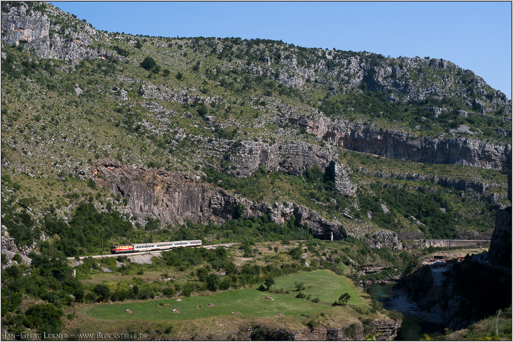 Der Nahverkehrszug nach Nikšić hat gerade die Wasserleitungen des Kraftwerkes passiert. Der weiße Klecks hoch oberhalb der Leitung in den Felsen ist übrigens das berühmte Felsenkloster von Ostrog. | |