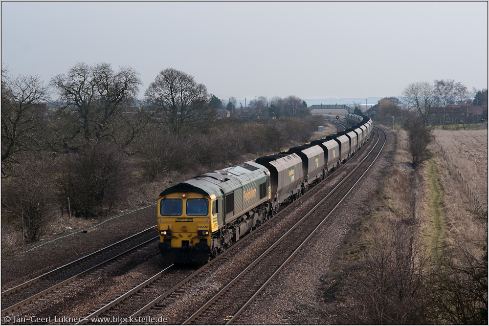 Zum nächsten Fotopunkt ging es nur einmal um den Hügel herum nach Melton Ross. Von einer ruhigen Nebenstraßenbrücke mit Namen "Knabbs Crossing" konnten wir entspannt beobachten, was unten so vor sich geht. Die Strecke war dreigleisig: Westwärts gab es neben dem normalen Streckengleis auch eine Slowline. So bestand keine Gefahr, dass die Güterzüge den "sagenhaften" Personenverkehr (paar ein- bis dreiteilige Triebwagen) behindern. Längere Zeit tat sich nun gar nichts. Doch dann kam erst ein kurzer EWS-Güterzug mit Doppeltraktion und dann mehrere Freightliner-Züge hintereinander durch. Davon ging dann auch einer in richtig brauchbarem Licht.