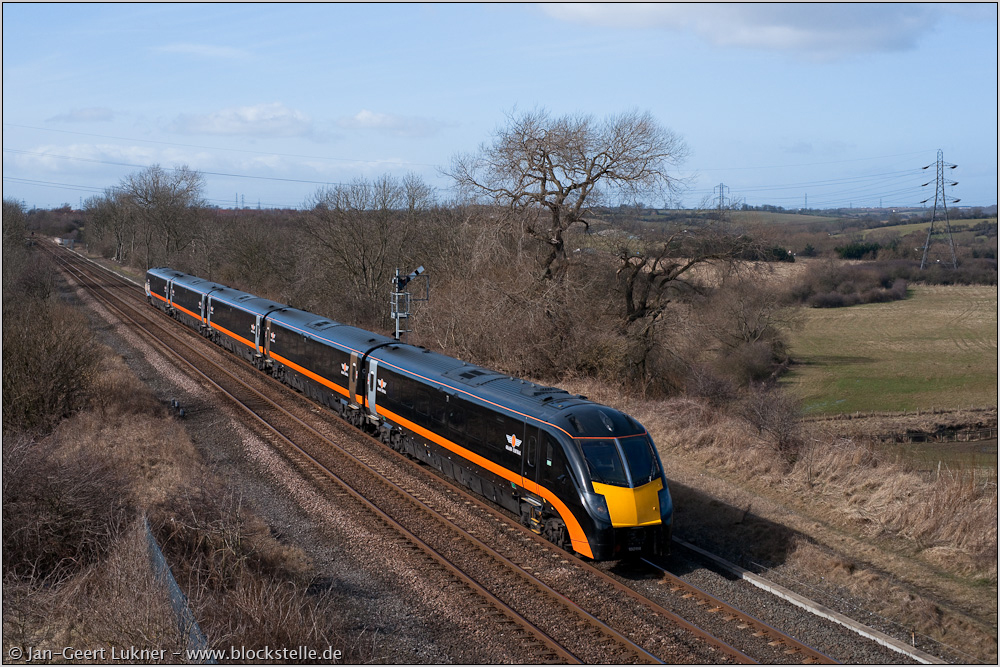 Dann ging es auf diversen Schnellstraßen durch Middlesbrough. Zur Querung des Tees nahmen wir allerdings weder die (sich momentan eh nicht bewegende) Schwebefähre, noch die tolle alte Hubbrücke, sondern eine moderne Hochbrücke. Unterwegs stellte ich dann auch fest, dass meine Brille offenbar noch im "herrlichen" South Bank auf dem Gehweg liegt. Unser Programm unterbrachen wir dafür allerdings nicht. Am Nordufer des Tees liegt Billingham. Von einer Straßenbrücke am westlichen Ortsrand sollte es der Grand Central Triebwagen sein. Diese Gesellschaft betreibt wechselweise mit HSTs oder neuen Adelante-Triebwagen (class 180) einen durchgehenden Fernverkehr von London über die Eastcoast Mainline bis nördlich York und dann zu Zielen auf dieser Zweigstrecke entlang der Durham Coast.