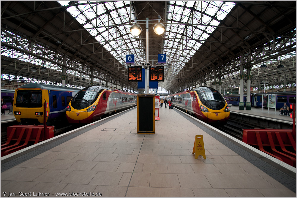 | "Manpic" - Manchester Piccadilly. Zwei Virgin Trains stehen zur Fahrt auf der Westcoast Mainline nach London bereit. Die gut zweistündige Distanz wird alle 20 Minuten bedient! |