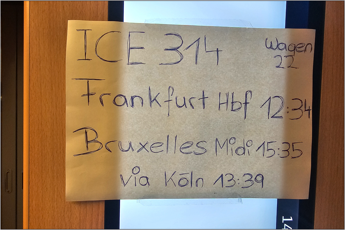 In Köln trafen wir Marcus und Matthias, die pünktlich aus Berlin angekommen waren. Aber nur kurz, denn die beiden waren nicht so geizig und hatten 1.Kl gebucht. Unser Anschlusszug, der bisher im Zulauf pünktliche ICE 314, hatte Kölner Stadtgebiet erreicht und war nun nicht mehr pünktlich. Final muss er ewig auf der Brücke gestanden haben, denn der zuvor in die westliche Bahnsteighälfte eingefahrene ICE war vermutlich (!) paar Meter zu kurz gefahren, so dass der Bahnsteigabschnitt für den 314 signaltechnisch noch mit besetzt war. Erst als der andere ICE abgeräumt wurde, konnte der 314 einfahren. Die Reservierungsanzeige funktionierte nicht und die Zuglaufschilder waren liebevoll handgeschrieben. Wir bekamen zunächst eine Vierersitzgruppe, die wir nichtmal teilen mussten.