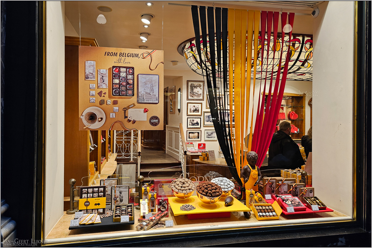 Dann ging es wieder abwärts. Unbemerkt querten wir die im Tunnel verlaufende Bahnstrecke und kamen nun in den schönen Teil der Altstadt mit zahlreichen Gassen. Ja, das war schon wesentlich netter! Dort gab es auch einige tolle Passagen. Bereits in Marollen und jetzt in der Innenstadt erst recht fielen die vielen Kunstateliers und -läden auf. Und wenn in einem Laden mal keine Kunst verkauft wurde, dann gab es Schokolade.