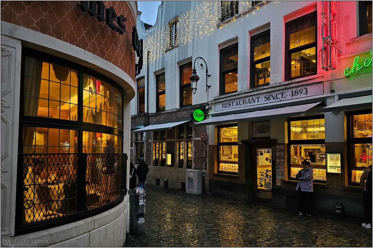 Brüssel hatten wir in die Anreise als Übernachtung eingebaut, um nicht die ganze Zeit um den Anschluss zu einem bestimmten Eurostar bibbern zu müssen. So waren wir komplett tiefenentspannt. Und ich kannte Bruxelles außer vom Umsteigen noch gar nicht. Gern hätte ich das Atomium besucht. Doch um dieses am nördlichen Stadtrand gelegene Wahrzeichen noch bei Tageshelligkeit zu erleben, wäre das nun eine ziemliche Hetzerei geworden. Deshalb hatten wir beschlossen, die zentrale Lage unseres Hotels zu nutzen und einen Spaziergang durch das benachbarte Viertel Marollen zu unternehmen. Einfach das Flair der Stadt aufnehmen.