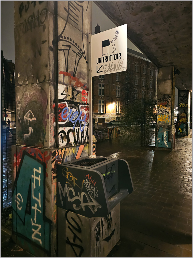 Ookaay... In der Stadt von Männeken Piss gibt es eine eigene Pinkelkultur - hier direkt vor den runtergelassenen Rolläden der Station Kapellekerk.