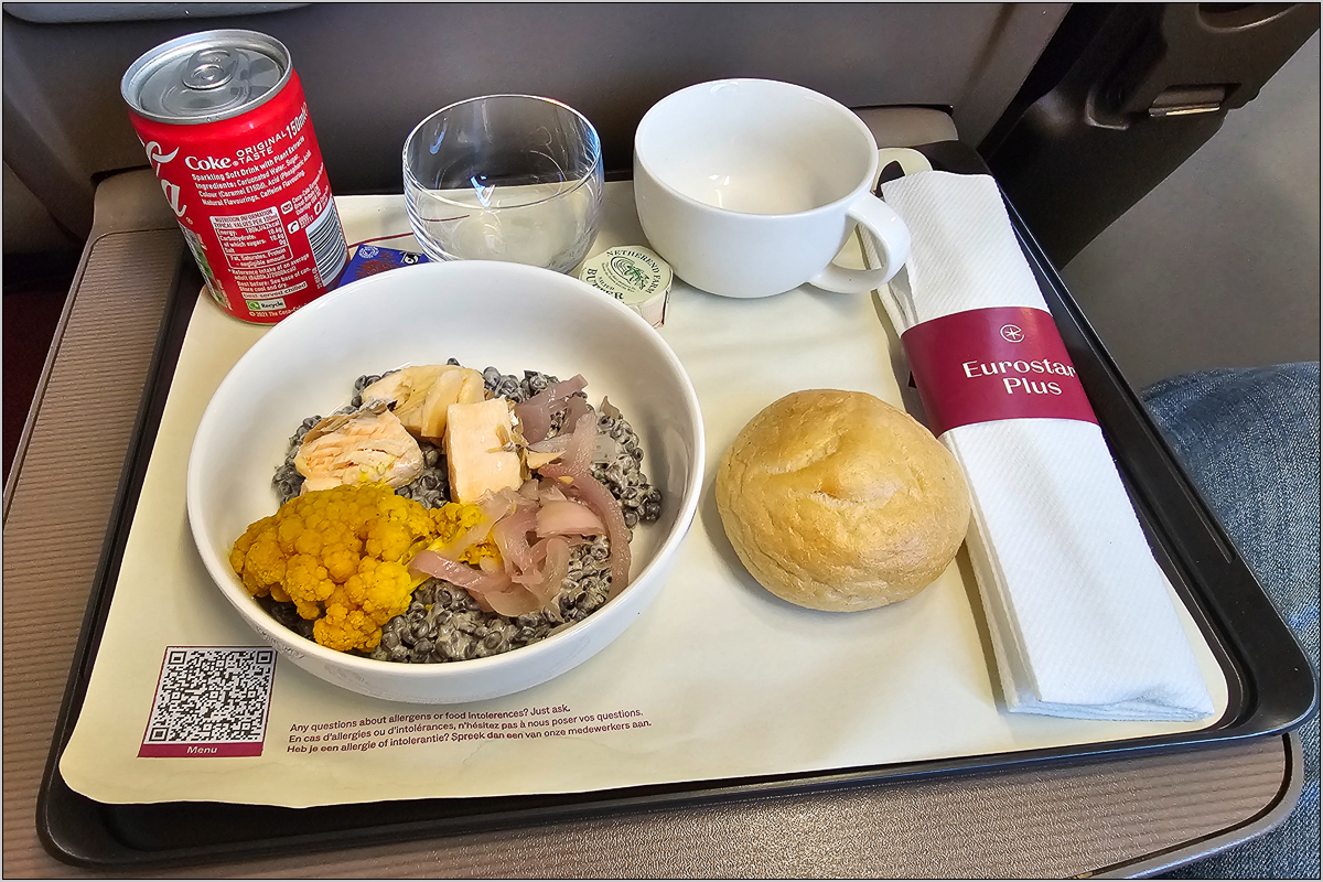 Hinter den ganzen Kontrollen kommt man in den Duty Free Shop und dann in den Wartebereich vor den Gates. Lange mussten wir gar nicht warten, da stand der Zug zum Boarding bereit. Man lief durchs Gate und --- befand sich atmosphärisch wieder im Bahnhof, wo man die Treppe zum Bahnsteig hochlief. Wir hatten Eurostar Plus gebucht. Nach dem Einnehmen des Platzes kam ein Steward durch, sprach jeden mit Namen an und fragte nach eventuellen Lebensmittelunverträglichkeiten. Diese Frage sollten wir noch häufiger zu hören bekommen...
