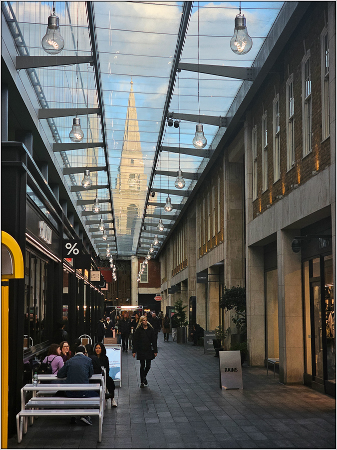 Um 16:15 trafen wir uns wieder, um etwas nordwärts zu laufen. Da kam bald das Stadtviertel Spitalfields - einer dieser lebendigen Stadtteile mit kleinen Lädchen und massenweise netten Restaurants. Als erstes drehten wir eine Runde über den Spitalfields Market, einer Markthalle, in der man wahrscheinlich alles bekommen kann. Vor allem aber war das kulinarische Angebot aus vielen exotischen Ländern begeisternd. Der knoblauchschwangere Duft hing in weiten Teilen der Halle und erinnerte uns daran, dass man langsam wieder Hunger haben durfte. Tief unter der Markthalle brausen die Züge der neuen Elisabeth Line (eine Art S-Bahn) durch den Untergrund.