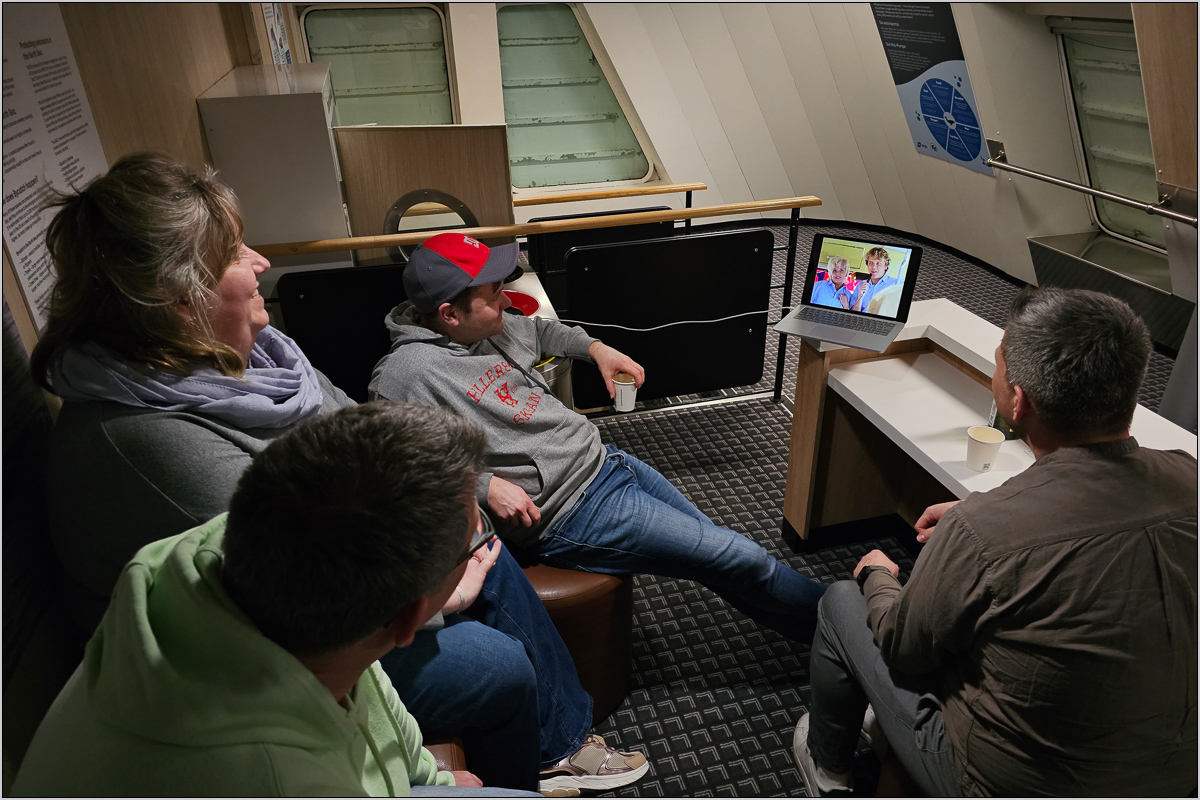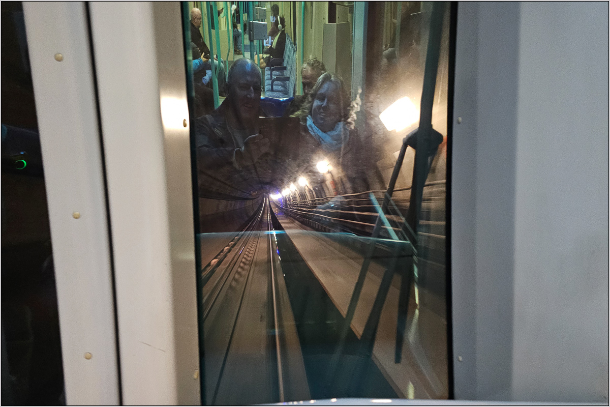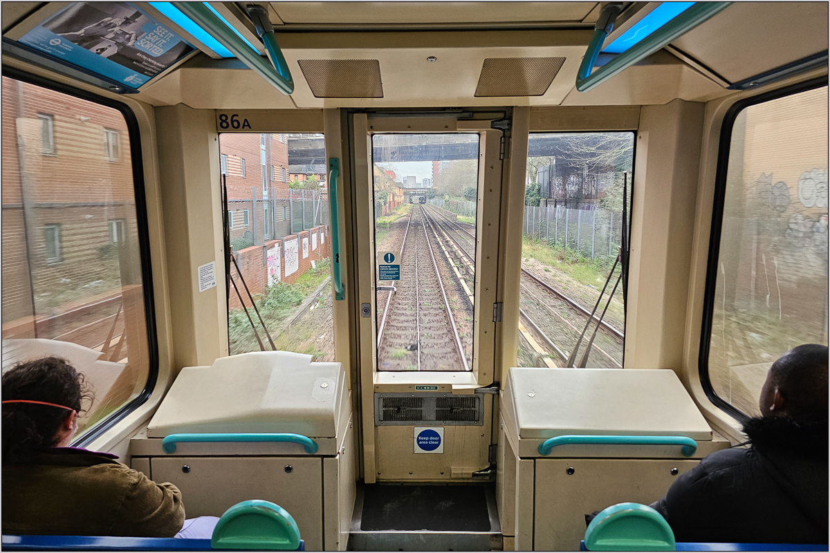 In Island Gardens mussten die beiden Fahrgäste, die vorn links saßen, nach hinten verschwinden, weil der Zugbegleiter dort das provisorische Führerpult öffnete und den Zug in irgendeiner Form übernahm. Wobei er da nur die ganze Zeit irgendeinen Knopf drückte; beschleunigt und gebremst hat er sicher nicht. Der einzige Grund für die Besetzung des Führerstandes war wohl die Durchfahrt durch die Haltestelle Cutty Sark, die wegen Bauarbeiten gesperrt war. Dort durfte er einmal schön das Horn bedienen.