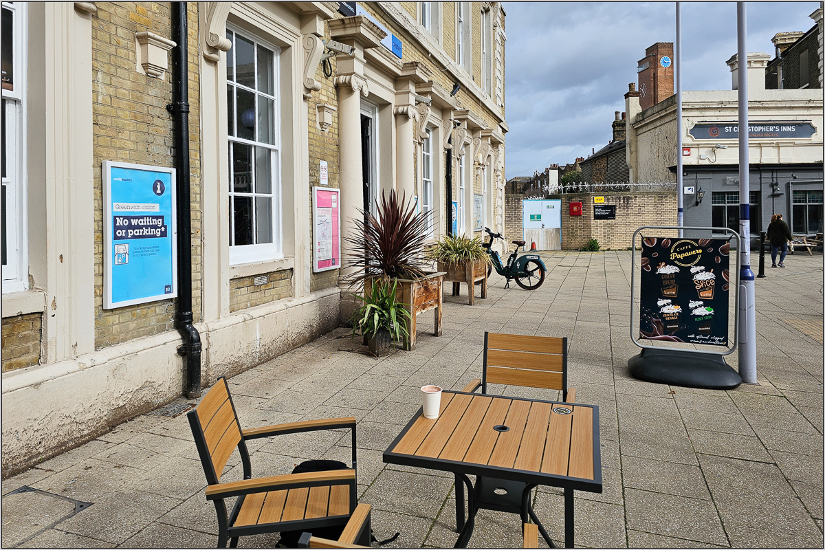 Dann lief ich durch Greenwich zum Bahnhof. Der ist richtig schnuckelig. Nur ein kleines Statiönchen, aber mit geöffnetem Fahrkartenschalter, einer gepflegten Toilette (an deren Tür die Warnung klebte, dass mit dem Reinigungspersonal vielleicht mal jemand vom anderen Geschlecht ins jeweilige Klo kommen könnte) und einem einfach eingerichteten Café mit paar Tischen in der Schalterhalle und draußen vor der Tür und einer richtigen Barista-Kaffeeanlage. Das frequentierte ich direkt mal. Bald kam auch Maren dazu. Hot Chocolate und Kaffee waren hervorragend. Und man saß auf dem Vorplatz sogar in der Sonne!