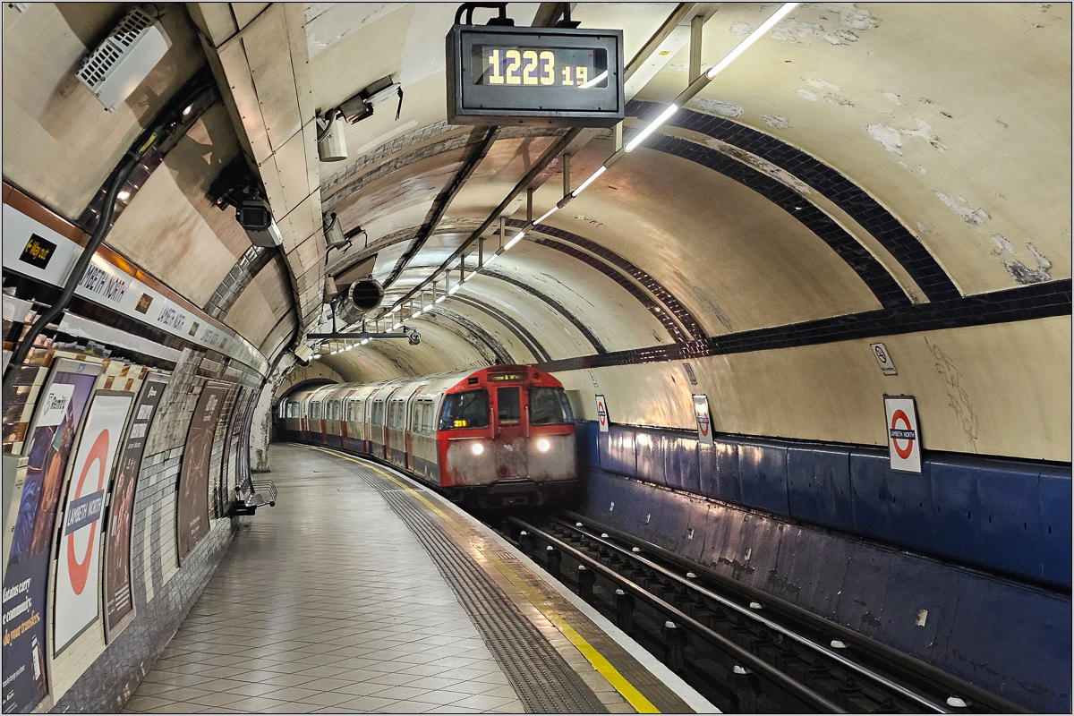 Meine einzige Fahrt mit der Schmalprofil-U-Bahn führt von Lambeth Nord nach Waterloo. Die alten Züge sehen nicht mehr so schick aus...