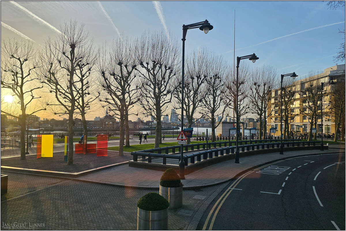 Dieser Abschnitt der DLR schien auf einer älteren Strecke, sicher einer alten Hafenbahn, entlang zu führen. Jedenfalls waren Brücken und Mauerwerke aus Backstein ausgeführt und wirkten nicht soooo neu. Die Züge fuhren zwar nicht mit Fahrer, wohl aber mit Schaffner ("Train Agent"). Moderner wurde es rund um die ganzen Streckenverzweigungen bei Poplar. In Canary Wharf mussten wir in einen anderen Zug umsteigen. Mit dem ging es nun nach Greenwich und dort bis zur Haltestelle Deptford Bridge.