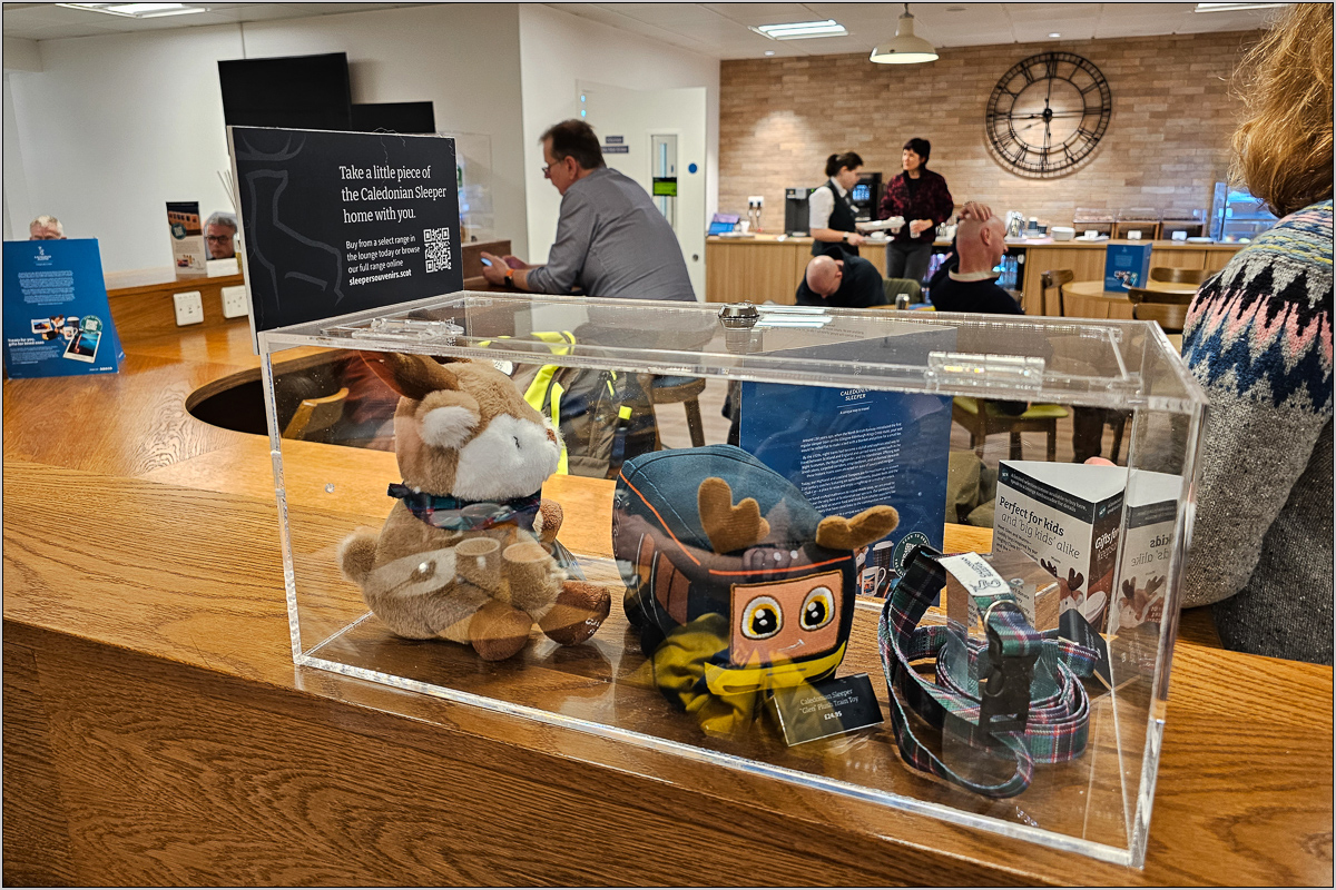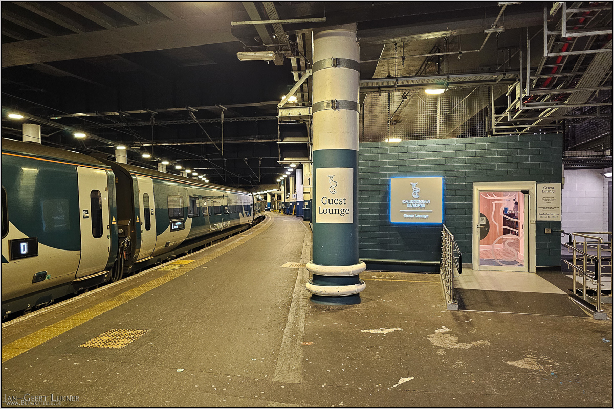 Nach dem Passieren einer Zugangskontrolle am Bahnsteiganfang und 100 Metern über den tristen Betonbahnsteig 1 erreicht man die Lounge des Caledonian Sleepers.