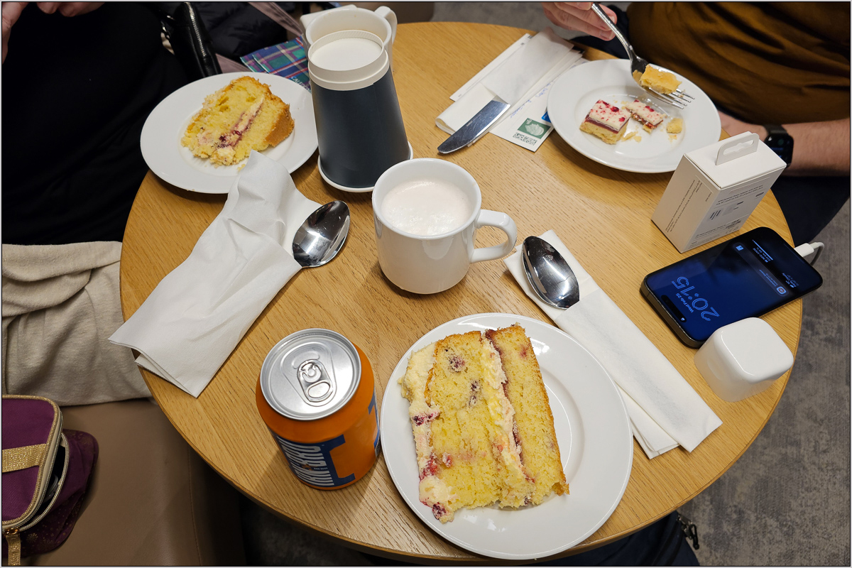 Der Caledonian Sleeper hat nun seine eigene Lounge, zu der man ein ganzes Stück an Gleis 1 hinein laufen muss. Die ist aber nur für Leute, die Club Room gebucht haben, also Abteil mit Dusche/WC. Und man muss aufpassen, denn nicht alles ist dort kostenlos. Immerhin konnte man sich ein Stück lecker Torte nehmen und eine Hot Chocolate, bei der das Kakaopulver offenbar zur Neige gegangen war.