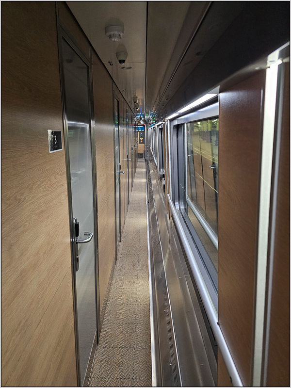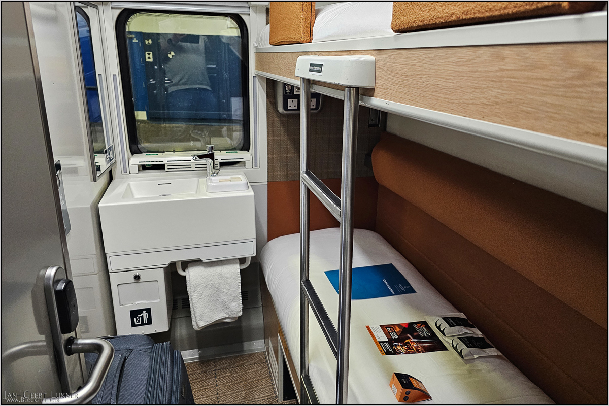 Dort checkte man auch ein. Das war nun etwas doof. Wir hatten uns bei der Buchung extra in Wagen E die Abteile 2-4 nebeneinander ausgewählt, bekamen jetzt aber zweimal Abteil 1 (in Wagen E und F) und einmal Abteil 2. Das war schon blöd, weil Abteil 1 am Drehgestell liegt und nebenan ein kleiner Dienstraum ist, in dem dauernd irgendein Telefon Töne von sich gab. Auf meine Reklamation hin verstand die Tante am Empfang aber überhaupt nicht, was ich wollte, denn ihr Englisch war offenbar schlechter als meins, was schon was heißen will. Dabei ließ sie mich mit künstlich-fiesem Lächeln im Gesicht merken, dass ich lästig war... Vielleicht war so wenig los, dass die gebuchten Abteile nicht gereinigt worden waren...