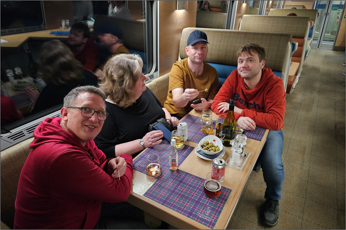 Abends trafen wir uns noch im Clubwagen. Die Regel scheint zu sein, dass Leute aus den Club Rooms sich als erste Platz im Clubwagen suchen durften. Das übrige Volk wurde erst eine Stunde später in den Wagen gelassen. Nun war etwas ärgerlich, dass Kai bei der Buchung gedacht hatte, dass ihm Dusche/WC im Abteil den Aufpreis nicht wert sind. Somit war er in der Lounge ausgeschlossen und würde morgen auch nicht zum für uns inkludierten Frühstück in den Clubwagen kommen dürfen. Immerhin durfte er jetzt am Abend von Anfang an mit dabei sein.
