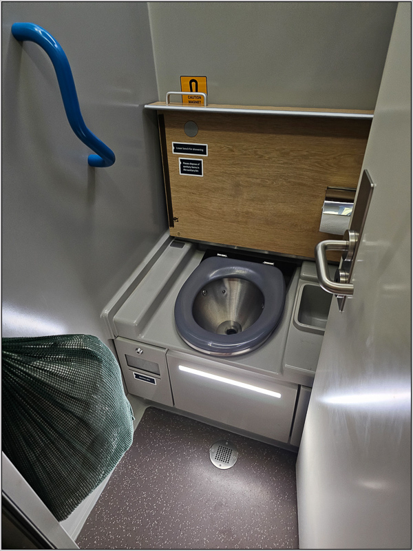 Wir waren ziemlich sicher, dass mit uns im Zug und auch im Clubwagen ein gewisser Rowan Atkinson reiste - besser bekannt als Mr Bean. Blicke von Bediensteten und anderen Reisenden könnten das bestätigt haben. Wobei sein Gesichtstyp in GB glaubich nicht so selten vorkommt. Irgendwann im Stadtgebiet von Birmingham ging es aber in die Kojen. Die Abteile waren etwas eigenartig, weil die fest mittig am Bett angebrachte Leiter ein bequemes Ein- und Aussteigen ins untere Bett verhinderte und man wegen der auch den Koffer nicht unter das Bett schieben konnte. Das Konzept der Dusch- und WC-Kabine war allerdings sehr schlau gelöst und man konnte topp duschen.