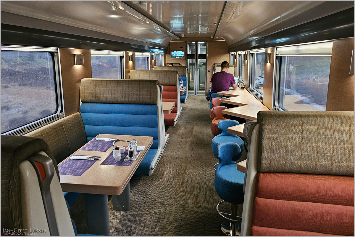 Die Clubwagen (dies ist jetzt ein anderer, aber gleicher Wagen) gehören eindeutig zu den gelungenen Aspekten des Zuges. Es gibt paar gemütliche Sitzgruppen (auf meiner Höhe links ein weiterer Vierer und rechts eine Gruppe mit zwei Einzelsitzen vis-a-vis). Aber die Idee mit den gezackten Tischen auf der rechten Seite finde ich auch richtig gut; hier kann man topp als Einzelreisender etwas zu sich nehmen.