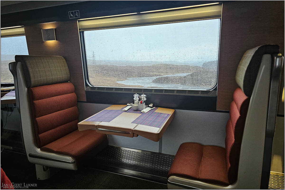 Im Clubwagen hatten wir uns als Gruppe für 8:30 angekündigt. Doch als ich gegen 8 Uhr die Nase vor die Abteiltür streckte, um mir einen Kaffee zu organisieren, traf ich zufällig Matthias und Marcus, die auch nicht mehr schlafen konnten. Kurzerhand liefen wir zum Clubwagen und ließen uns schon mal vorab drei große Becher Kaffee und einen schönen Tisch geben. Das war nun der Höhepunkt der Reise. Von Upper Tyndrum bis Rannoch mit Kaffee und von Rannoch bis Tulloch mit einem zweiten Becher Kaffee und dem Cooked Scotish Breakfast - das war der landschaftlich herrlichste Teil der Fahrt garniert mit einem schönen Frühstück. Von unserem Tisch hatten wir einen topp Blick auf die Landschaft. DAS war mal wieder Reisen in Bestform.
