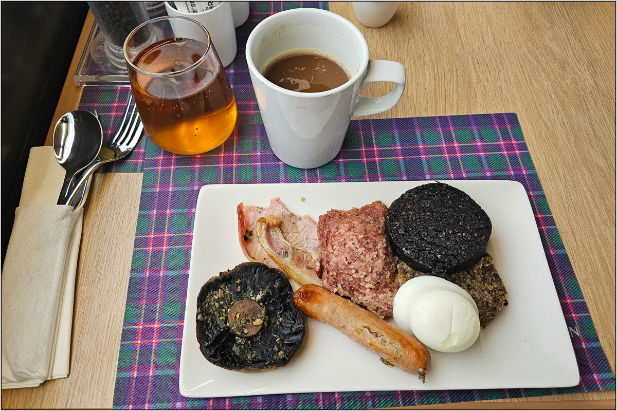 Das Scotish Breakfast macht gegenüber dem im alten Zug einen richtig guten Eindruck. Mir fehlten bloß die backed beans...