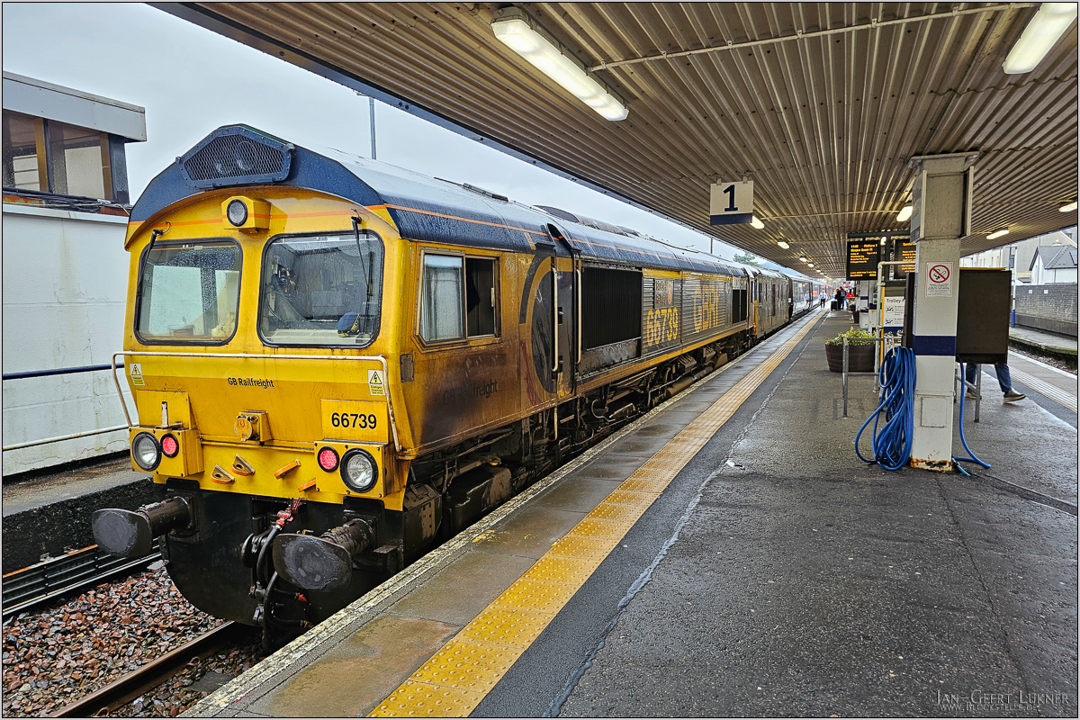 Angekommen in Fort William. Die Teile des Sleepers werden immer mit zwei Loks bespannt. Wir hatten eine Class 66 und eine 73.
