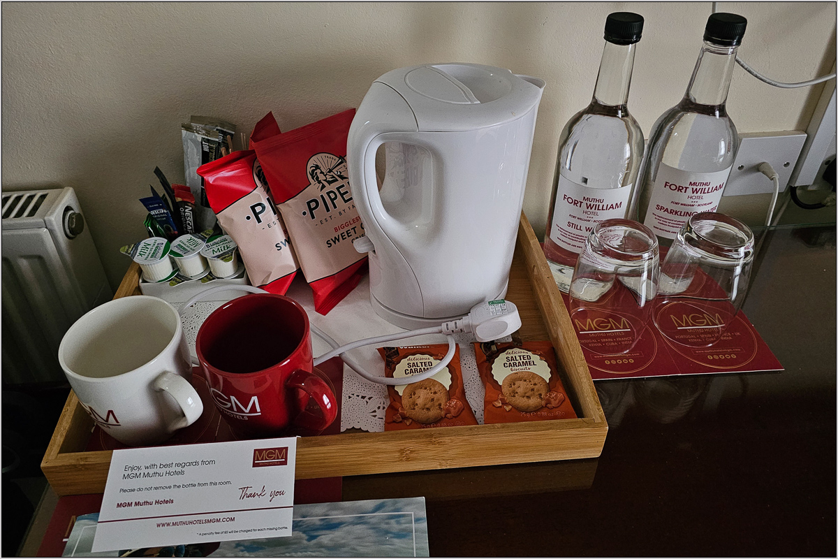 Trotz verspätetem Gegenzug in Rannoch kamen wir 8min zu früh in Fort William an. Die Überlegung war jetzt, wo man die Koffer lässt. Es hätte Möglichkeiten am Bahnhof gegeben, aber wir wollten es mit dem Hotel probieren, das wir hier ab heute gebucht hatten. Durch strömenden Regen ging es einmal die ganze Geschäftsstraße entlang. Im Muthu Hotel war gerade nichts los. Wir bekamen keine Abstellkammer für die Koffer gezeigt, sondern konnten jetzt um 10:30 direkt in unsere Zimmer einchecken. Und das ganz ohne Aufpreis! Da fühlt man sich als Gast doch gewertschätzt! Die zweite Wertschätzung war das reichhaltige Angebot an Mineralwasser, Kaffee, Tee und Keksen, das einem im Zimmer frei zur Verfügung gestellt wurde.