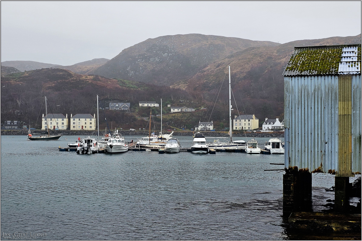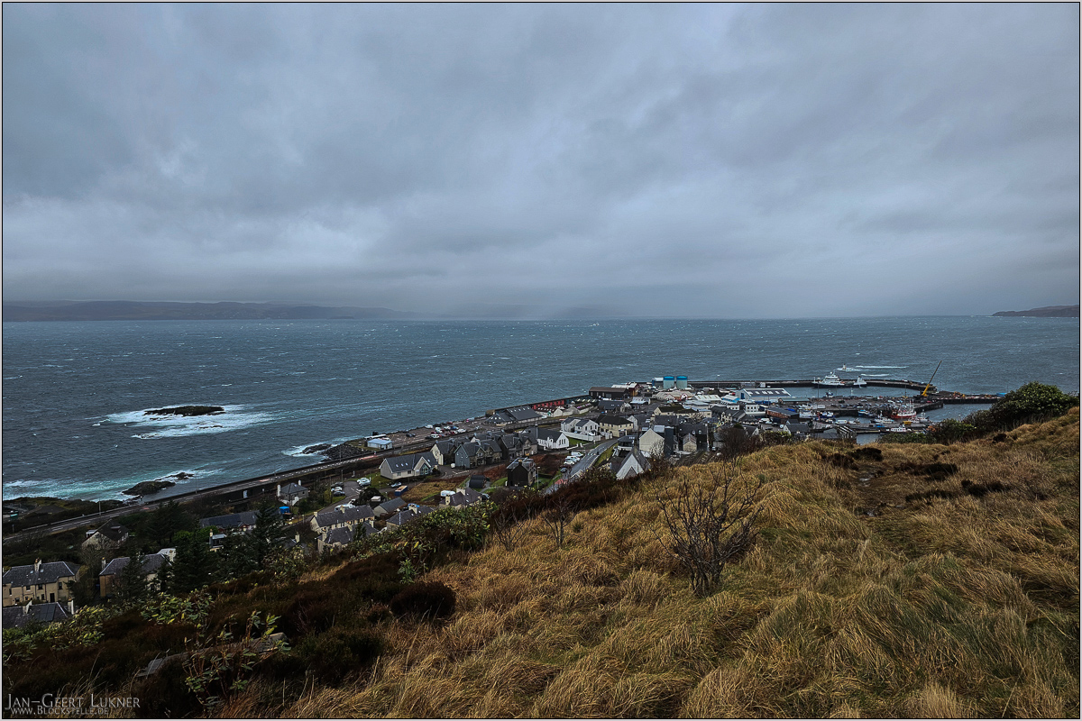 Am Hafen von Mallaig. Leider kommen die Regenschwaden auf dem Bild nicht wirklich zur Geltung.