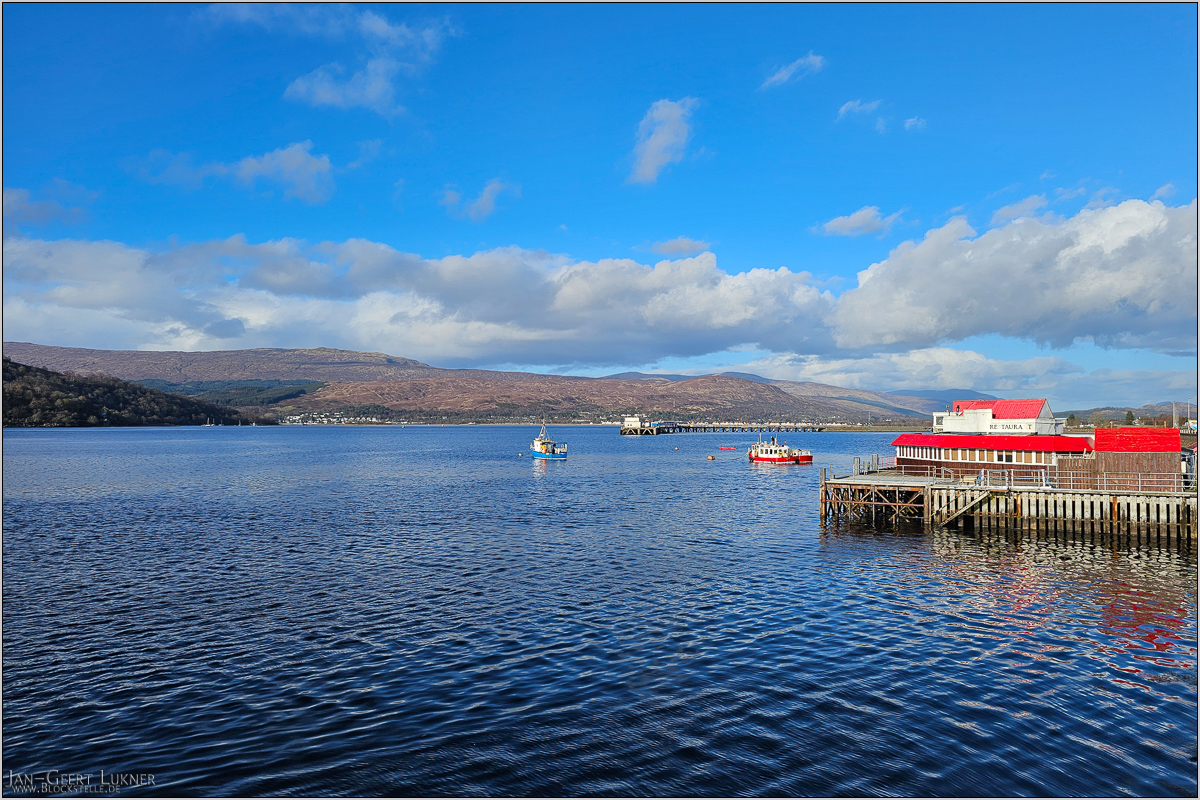Als ich auf dem Uferweg wieder auf Höhe der Fotobrücke für die Loks war, war es komplett zugezogen. Nur weiter im Westen war es komplett blau. Dort wäre aber auch nichts gefahren... Mir reichte es erstmal. Weiter entlang des Flusses und dessen Mündung in den Loch Linnhe, einem weit ins Land hineinragenden Fjord, ging es ins Hotel zurück. Dabei nutzte ich den Fußweg der Umgehungsstraße, der direkt am Ufer des Fjordes entlang führte und von dem man, wie es sich für den Fußweg einer Umgehungsstraße gehört, erst am anderen Ende der Stadt überhaupt wieder in die Stadt kam. Für das Hotel passte es aber gut. Da gab es erstmal Mittagsschläfchen, dann die im Zimmer kredenzten Kekse mit Kakao.