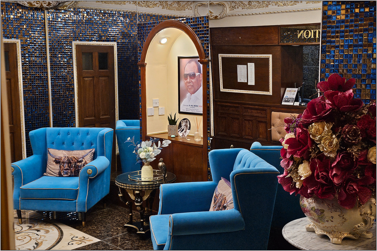 Das Hotel war in einem alten Gebäude, aber alles war gut und sauber. Ich hatte einen ruhigen Raum und konnte wunderbar schlafen. Etwas eigentümlich fand ich nur den Altar gegenüber der Rezeption, mit dem Dr. Muthu gehuldigt wurde. Dort prangte groß das Gesicht des Gründers dieser weltweit operierenden Hotelkette. Das Zeitfenster für das Frühstück endete unter der Woche bereits um 9, so dass wir uns um 8:00 zum Frühstück versammelten. Das Frühstück war ausgezeichnet und konnte alle Wünsche erfüllen.