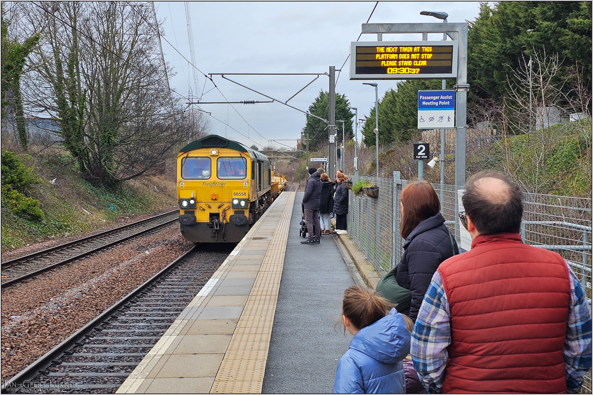 Auf den sonntags ersten Zug des Tages warteten in Brunstane schon wieder massig Reisende. Ein zuvor in der Gegenrichtung durchkommender Departmental Güterzug verbog unseren Zug in Newcraighall dann sogar um paar Minuten.
